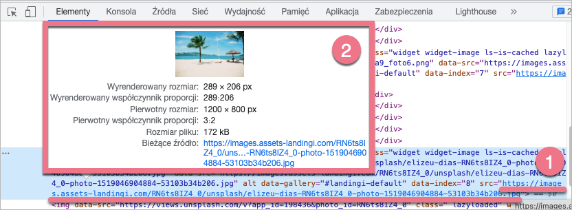 3. Najedź kursorem na link src (1). W wyskakującym okienku (2) zobaczysz link (bieżące źródło) oraz rozmiar oryginalnego (pierwotnego) obrazu, a także jego pozostałą charakterystykę.