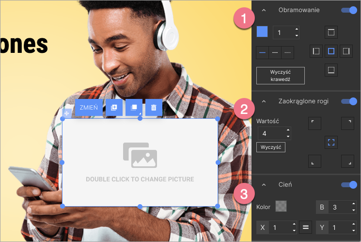 Znajdziesz tam trzy zakładki, które pozwolą Ci na edycję obrazu: (1) Obramowanie, (2) Zaokrąglone rogi, (3) Cień.
