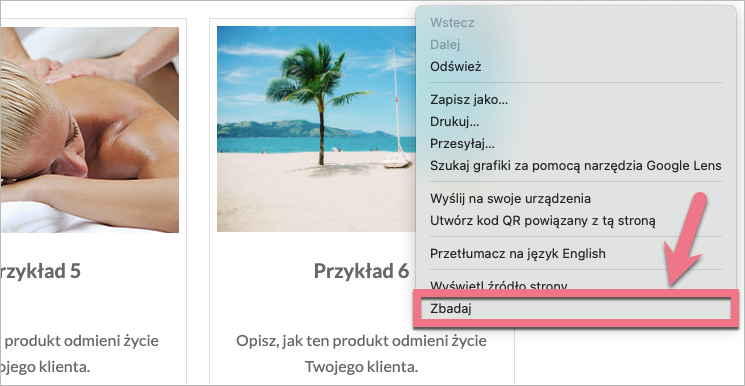 1. Otwórz opublikowany landing page i kliknij prawym przyciskiem myszy obok obrazu. Wybierz Zbadaj.
