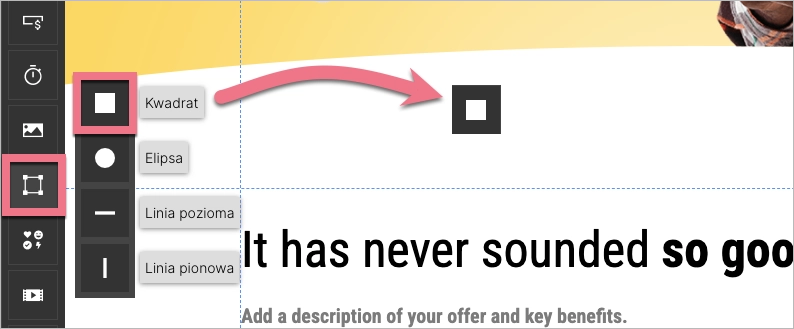 1. W edytorze znajdź widget Kształty, wybierz jeden z kształtów i przeciągnij go w wybrane miejsce w obszarze aktywnym landing page’a.