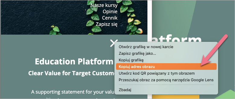 12. Z opublikowanego landing page’a pobierz adresy URL ikon: kliknij ikonę prawym przyciskiem myszy i wybierz Kopiuj adres obrazu. Skopiuj adresy obu ikon.