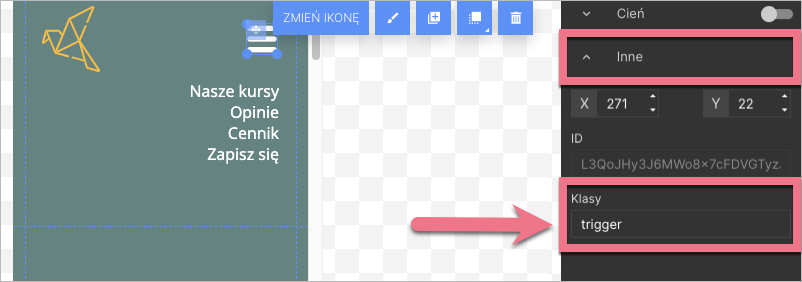 7. Zaznacz ikonę menu i w toolbarze po prawej stronie odszukaj zakładkę Inne. Wpisz trigger w polu Klasy.