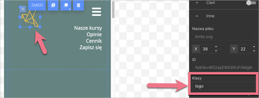 1. Kliknij obraz, który jest Twoim logo, i w toolbarze po prawej stronie odszukaj zakładkę Inne. Wpisz logo w polu Klasy.