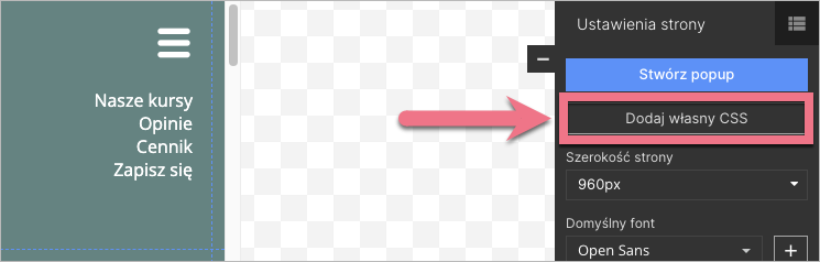 9. Wejdź w Ustawienia strony w panelu bocznym po prawej stronie, a następnie kliknij przycisk Dodaj własny CSS.