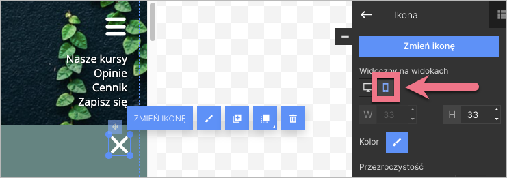 17. Wróć do edytora. W widoku mobilnym kliknij ikonę zamykającą menu, a następnie w panelu bocznym wyłącz jej widoczność.