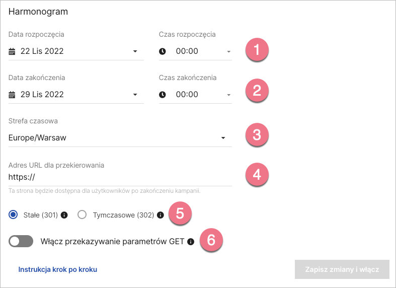 - Ustaw datę i godzinę rozpoczęcia kampanii. Zanim kampania wystartuje, pod adresem landing page’a użytkownicy zobaczą stronę błędu 404.