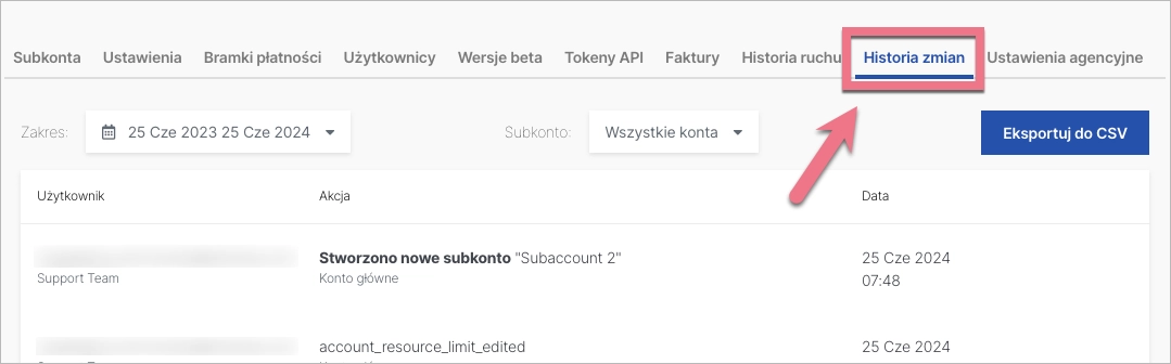 2. Historię zmian możesz filtrować po Zakresie dat (1) albo Subkontach (2). Możesz także wyeksportować listę zmian do pliku CSV (3).