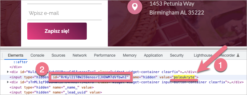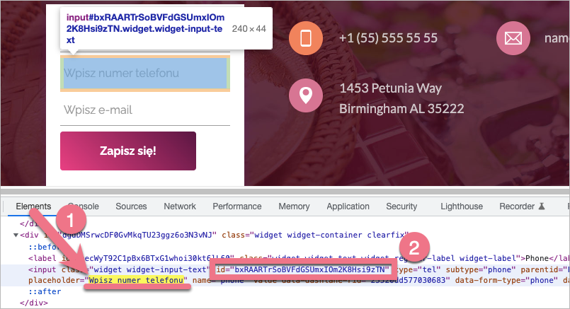 2. Zobaczysz okno z kodem HTML strony. Wyszukaj pole formularza (1), np. szukając placeholdera (wykorzystaj skrót klawiaturowy Cmd/Ctrl+F). Przed placeholderem zobaczysz numer ID pola (2).