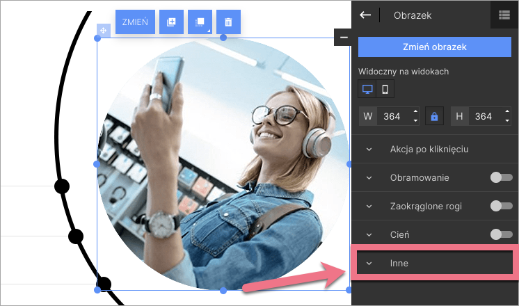 2. Kliknij wybrany element i w jego ustawieniach w toolbarze po prawej stronie znajdź zakładkę Inne.
