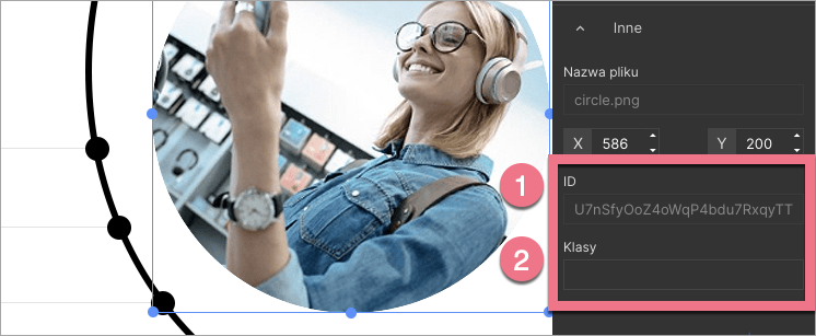 3. Po rozwinięciu zakładki zobaczysz ID elementu (1) oraz pole jego klasy (2).