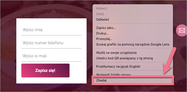 1. Otwórz opublikowany landing page i kliknij prawym przyciskiem myszy obok formularza. Wybierz Zbadaj.