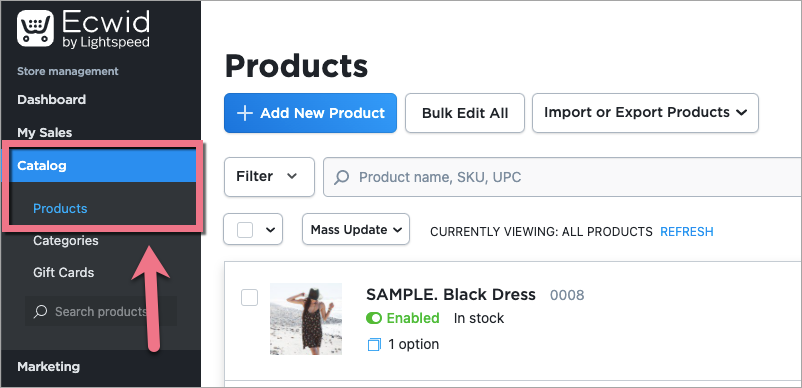 Zanim rozpoczniesz umieszczanie wszystkich produktów na landing page’u, upewnij się, że wszystkie, które powinny się tam znaleźć, są dodane w Twoim koncie w platformie Ecwid.