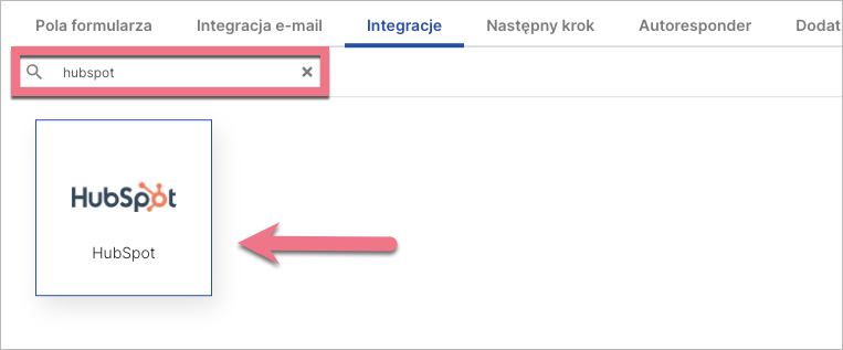 3. W zakładce Integracje wybierz HubSpot. Wpisz nazwę integracji w wyszukiwarce i kliknij enter.