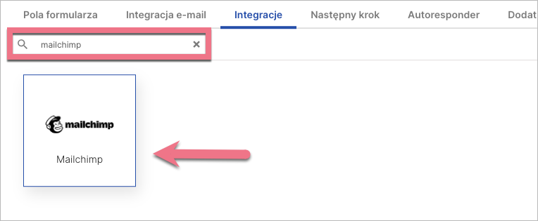 3. W zakładce Integracje wybierz Mailchimp. Wpisz nazwę integracji w wyszukiwarce i kliknij enter.