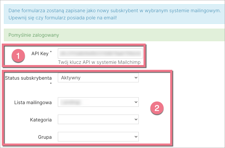 4. Wklej swój klucz API w polu API Key (1). Pola poniżej (2), zdefiniowane wcześniej w platformie Mailchimp, po pomyślnym zalogowaniu zaktualizują się automatycznie. W każdej chwili możesz je zmienić w zależności od swoich potrzeb.