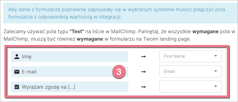 5. Połącz pola formularza (3) z polami w integracji. Następnie Zapisz i zamknij.