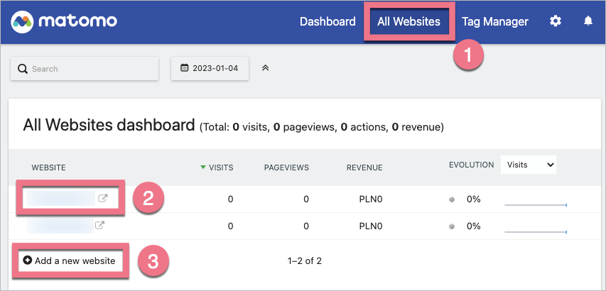 3. Jeżeli Twoja strona już jest dodana w Matomo, znajdziesz ją w zakładce All Websites (1). Aby skopiować kod śledzący, kliknij nazwę strony (2). Możesz także dodać nową stronę (3).