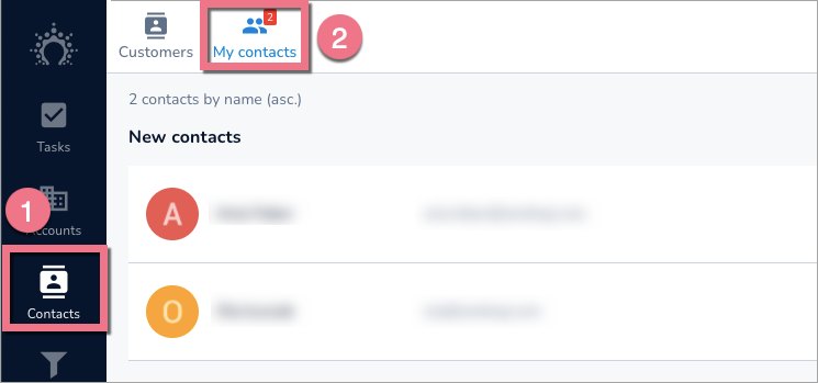 Aby zobaczyć swoje leady w Salesflare, przejdź do zakładki Contacts (1) i My contacts (2).