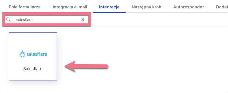 3. W zakładce Integracje wybierz Salesflare. Wpisz nazwę integracji w wyszukiwarce i kliknij enter.