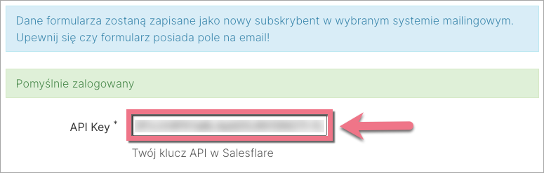4. W polu API Key wklej klucz skopiowany z Salesflare.