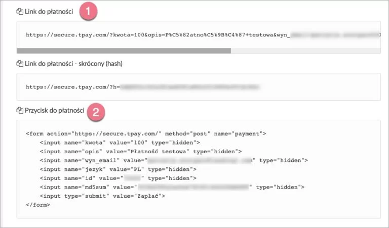 2. Zobaczysz wygenerowane dwa linki oraz jeden kod. Wykorzystaj jeden z nich w zależności od tego, czy chcesz zintegrować widget Przycisk (1) lub umieścić dedykowany przycisk „Zapłać” (2).
