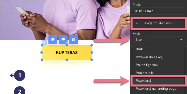 2. Kliknij w przycisk, który ma przekierowywać do strony płatności. W panelu po prawej stronie odszukaj zakładkę Akcja po kliknięciu i wybierz Przekieruj jako akcję.