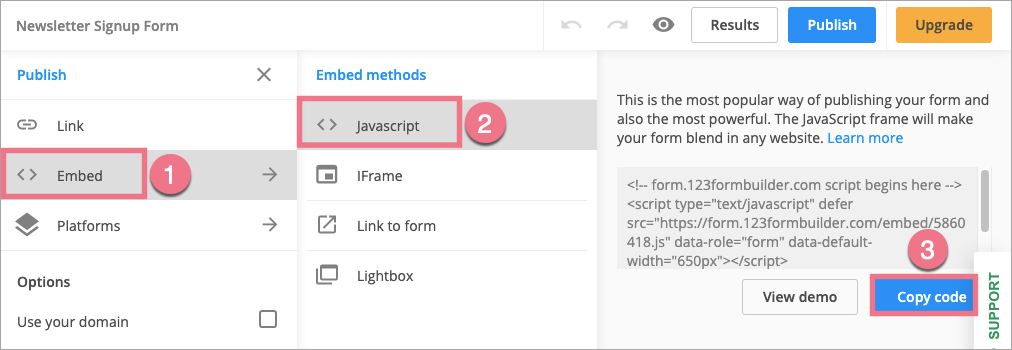 4. Aby pobrać kod, kliknij w Embed (1) > JavaScript (2) i skopiuj kod (3). Przejdź do Landingi.
