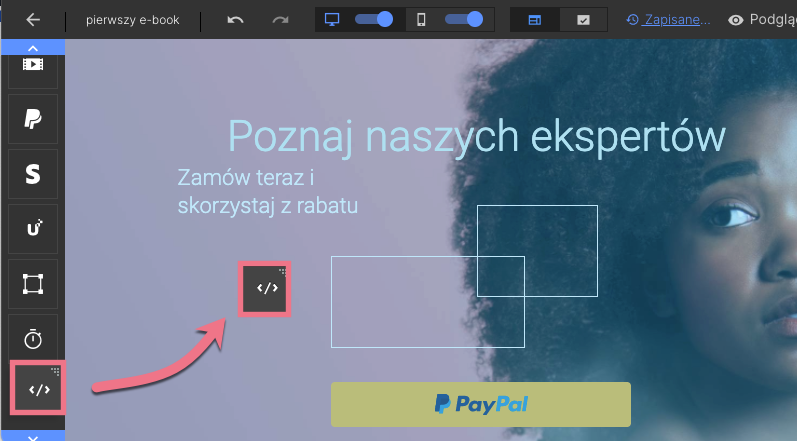 2. Po lewej stronie edytora odszukaj widget HTML, następnie przeciągnij go i upuść w obszar aktywny Twojego landing page’a.