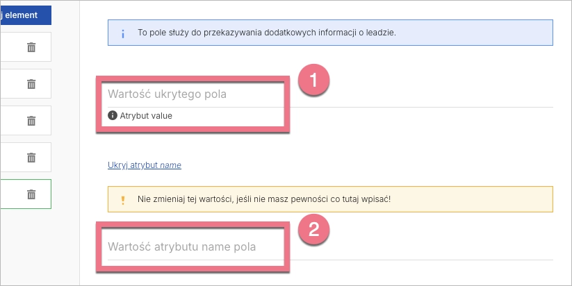 Kod webinaru powinien znaleźć się w polu ukrytym. Aby je dodać, kliknij Dodaj element (1) i wybierz Pole ukryte (2).