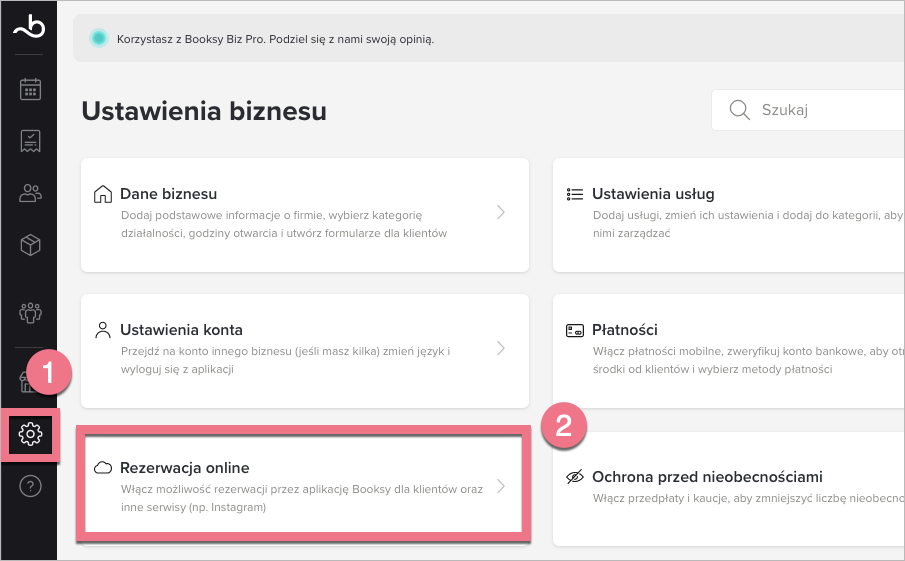 2. Przejdź do Ustawień (1) i wybierz Rezerwacja online (2).