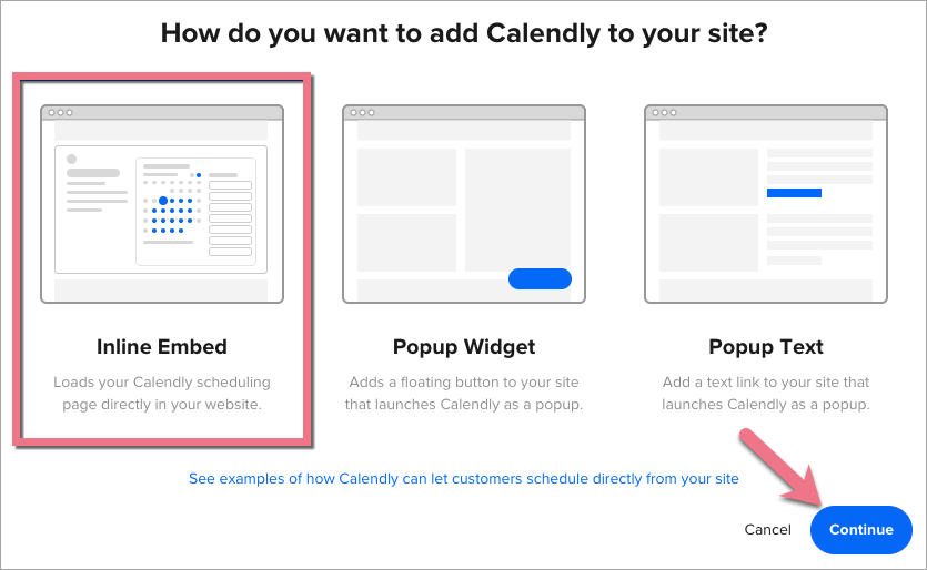3. Wybierz sposób umieszczenia na stronie – w naszym przykładzie wybraliśmy Inline Embed (bezpośrednio na stronie). Następnie kliknij Continue.