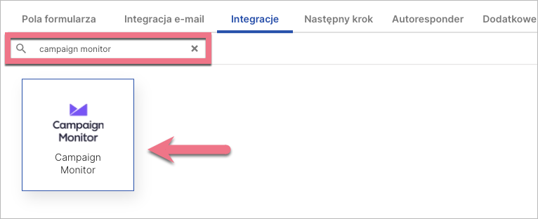 2. Wejdź w zakładkę Integracje i wybierz Campaign Monitor. Wpisz nazwę integracji w wyszukiwarce i kliknij enter.