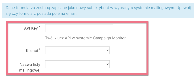 3. Wklej klucz API skopiowany z Campaign Monitor. Wybierz klienta i nazwę swojej listy mailingowej (jeżeli nie zaktualizują się automatycznie).