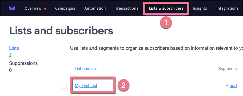 1. Zaloguj się na swoje konto w Campaign Monitor. Jeżeli masz w swoim formularzu niestandardowe pola, najpierw przejdź do zakładki Lists & subscribers (1) (listy i subskrybenci) i kliknij swoją listę (2).