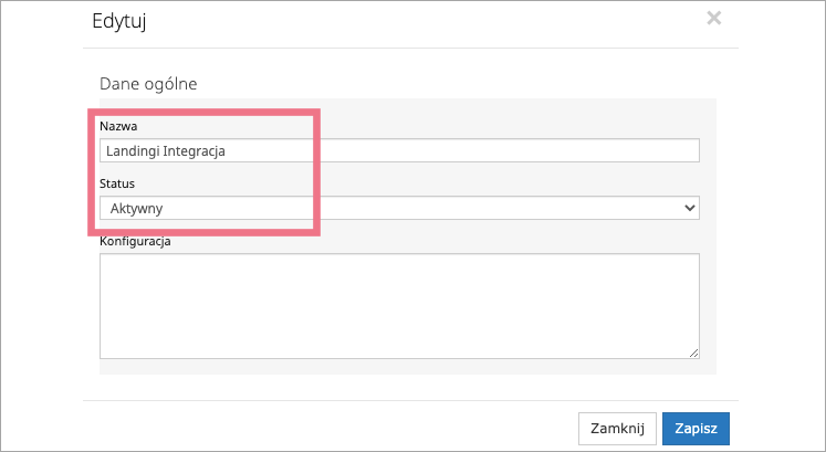 4. Nazwij swoją integrację i upewnij się, że jej status jest Aktywny, a następnie zapisz zmiany.