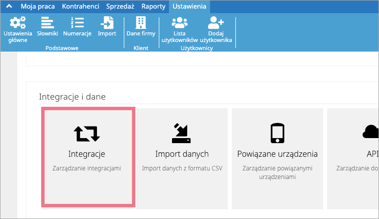 2. Przewiń na sam dół strony i przejdź do zakładki Integracje.