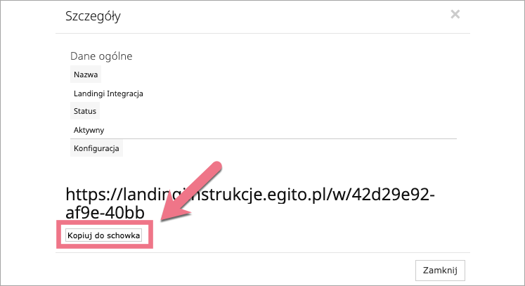 6. Skopiuj adres URL z pola Konfiguracja i przejdź do platformy Landingi.