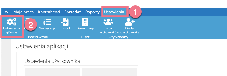 1. Zaloguj się do swojego konta w Egito i wejdź w Ustawienia (1) > Ustawienia główne (2).