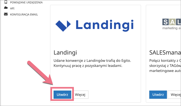 3. Znajdź sekcję Landingi i kliknij Utwórz.
