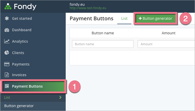 2. Przejdź do zakładki Payments Buttons (1) (przyciski płatności) i kliknij w +Button generator (2).