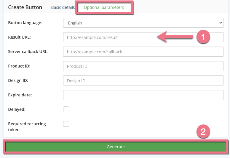 4. W zakładce Optional parameters, w polu Result URL (1) możesz wkleić adres landing page’a, który zostanie wyświetlony użytkownikom po sfinalizowaniu płatności.