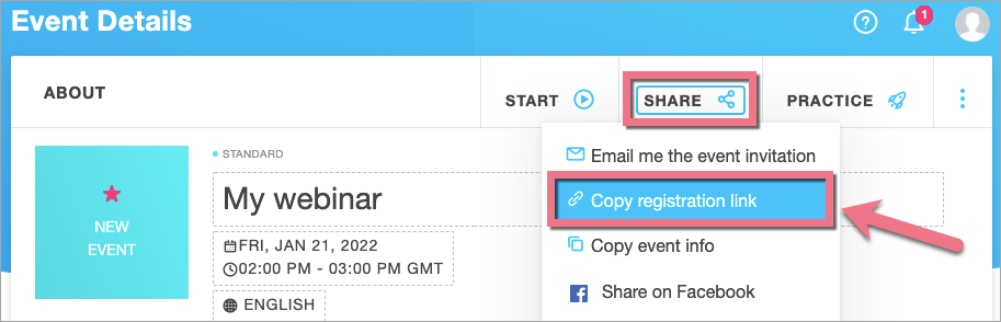 4. W oknie Event Details kliknij Share i wybierz Copy registration link.