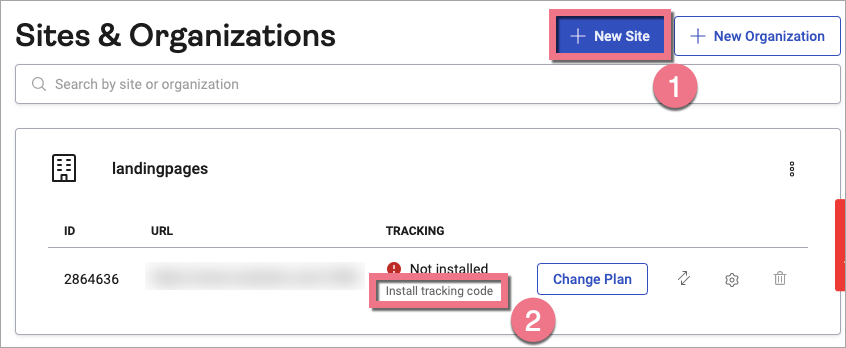2. Wybierz stronę lub dodaj nową, klikając + New Site (1). Następnie kliknij Install tracking code (2).