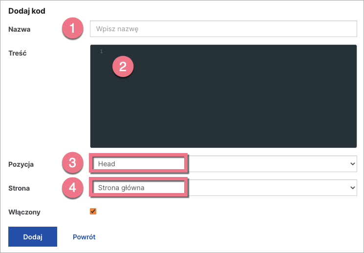 3. Nadaj nazwę (1) i wklej kod w polu Treść (2). Wybierz pozycję Head (3) na Stronie głównej (4). Zapisz, klikając Dodaj.