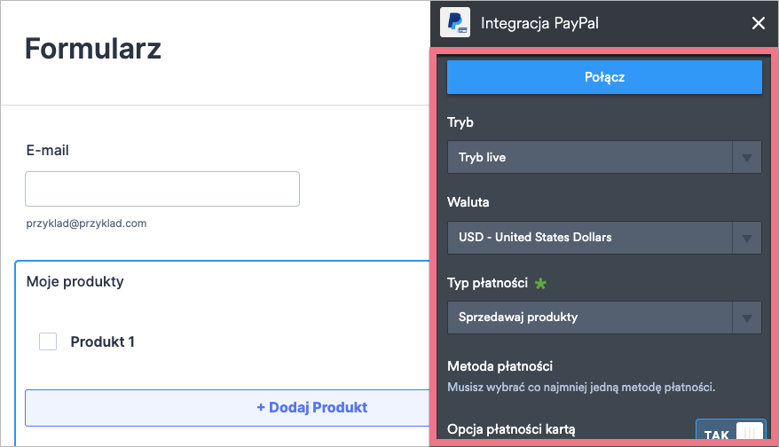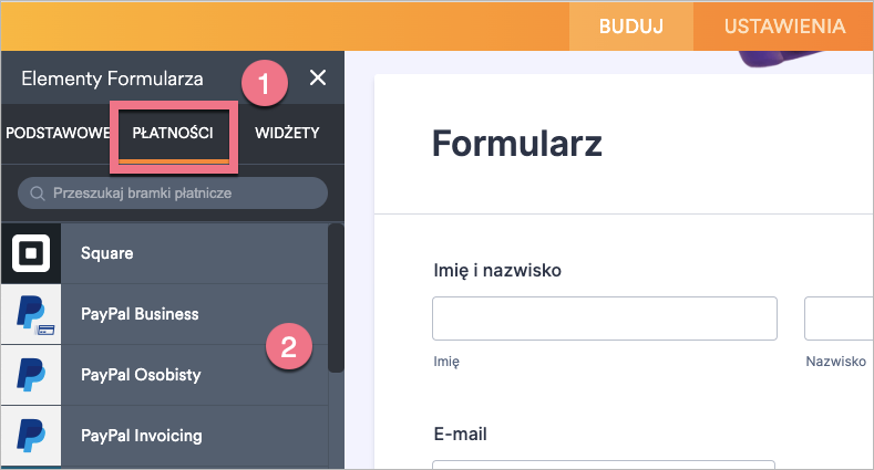 2. Aby dodać do formularza bramkę płatności, kliknij Płatności (1) i wybierz jedną z dostępnych integracji (2).