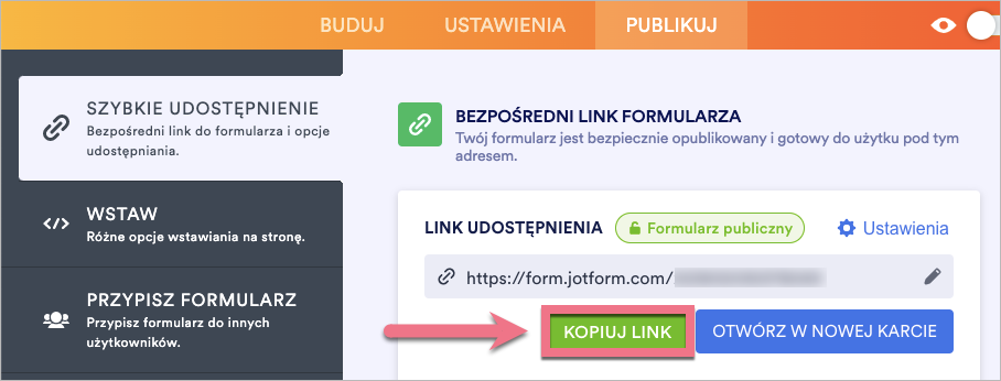 Pobierz link formularza z Jotform