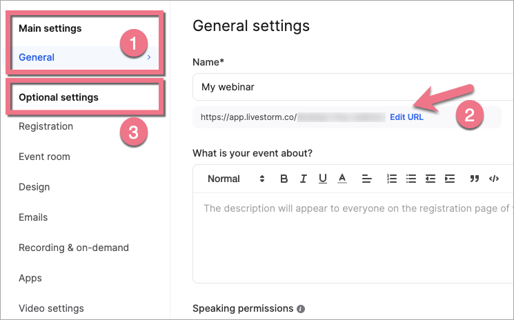 4. Z ustawień ogólnych (General settings (1)) skopiuj adres URL swojego wydarzenia (2). W pozostałych ustawieniach (Optional settings (3)) możesz spersonalizować wygląd okna Livestorm czy ustawienia pokoju.