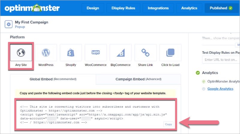 3. Przejdź do sekcji Platform i kliknij Any Site. Możesz wybrać kod dla całego konta (globalny) lub dla pojedynczej kampanii. Skopiuj wybrany kod.