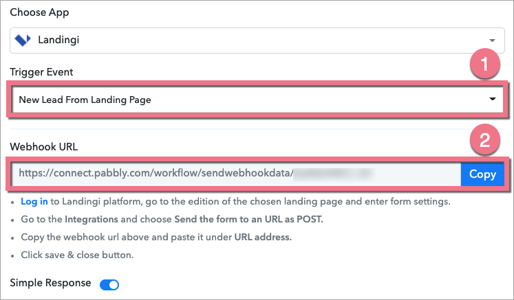 5. Jako Trigger Event wybierz New Lead From Landing Page (1). Następnie skopiuj Webhook URL (2).