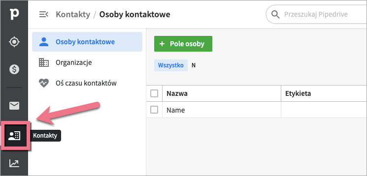 Aby zobaczyć swoje leady w platformie Pipedrive, przejdź do zakładki Kontakty.